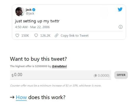 而在购买NFT时,您既获得了资产不可篡改的所有权记录,也获得了对实际资产的访问权限,这些资产可以是任何东西。就在不久之前,Twitter 创始人杰克·多西在 Twitter 上说要把自己首条推文当作NFT拍卖,结果出价最高竟然达到了250万美元,反响可见一斑。
